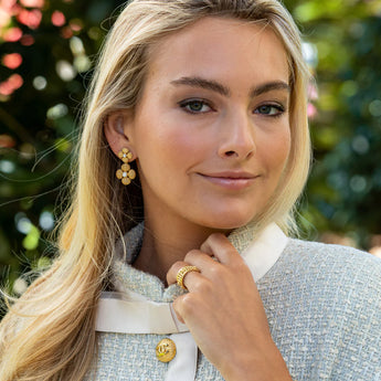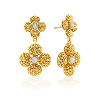• Golden berries are clustered in clovers with luminous mother of pearl centers to create this pair of drop earrings that can be easily converted to just the studs by removing the bottom clover—making this set a gorgeous and gilded two-for-one. Lucky you!