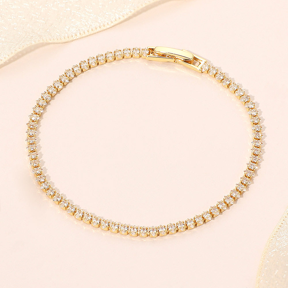 • This delicate crystal tennis bracelet embodies understated elegance with its fine line of sparkling stones. Perfect for both day and evening wear, it adds a refined shimmer to any ensemble. A timeless jewelry essential designed to complement every style with effortless sophistication.