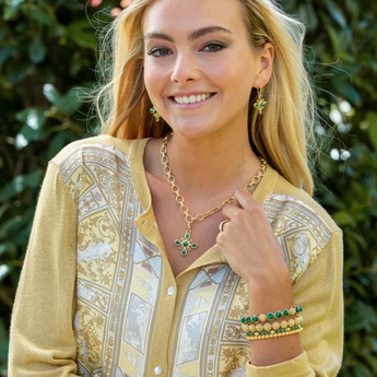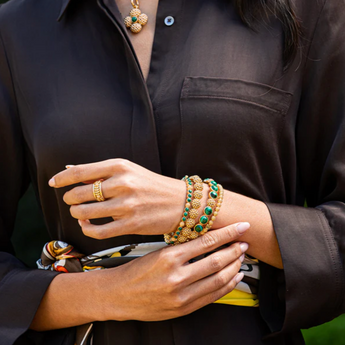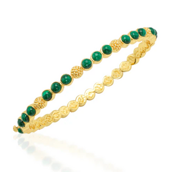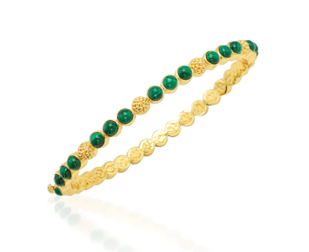 Trios of gorgeous green malachite are united by a sprinkling of golden berries to create this refined bangle that adds a fabulously feminine flourish to any ensemble—whether you’re running a meeting, hosting a dinner party or jet-setting to Monaco.