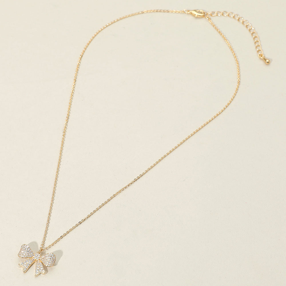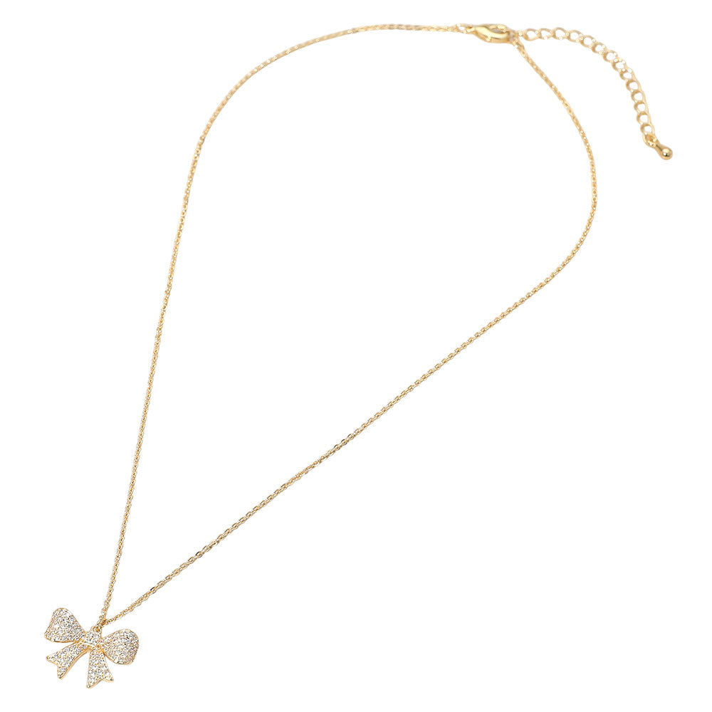 • Dainty necklace featuring a graceful bow pendant adorned with sparkling cubic zirconia. Its delicate design brings a charming accent to everyday or special occasion looks. Lightweight, and refined.