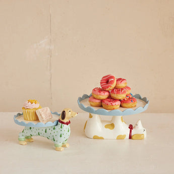 8-1/4"L x 6"W x 5"H Stoneware Scalloped Cake Stand w/ Dachshund Shaped Base, Multi Color