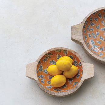 14-3/4"L x 11-1/2"W x 2-3/4"H & 11-3/4"L x 9"W x 2-1/2"H Enameled Mango Wood Bowls w/ Handles & Floral Pattern, Natural, Mustard Color & Blue