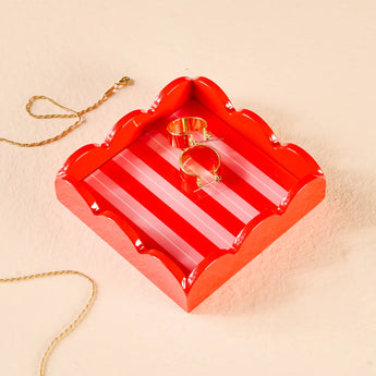 Darling scalloped rim detail Featuring floral or festive design Store bracelets, earrings and more! Glossy finish Dimensions: 4”L x 4”W x 1”H