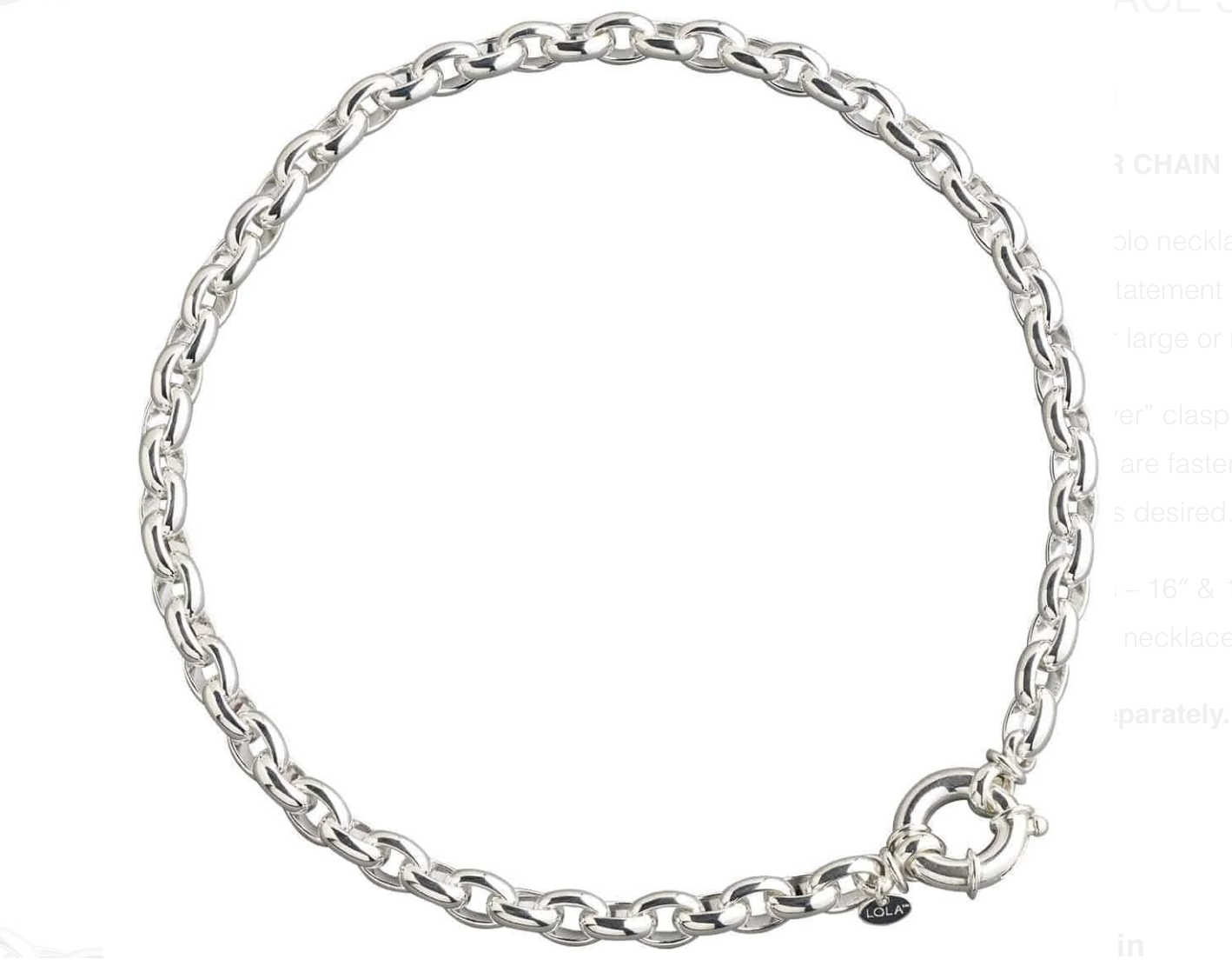 • LOLA’s stunning 9mm rolo necklace with a gorgeous, detailed trigger clasp is truly a statement piece. The necklace can be worn with or without our large or medium pendants.