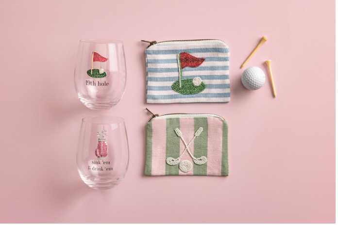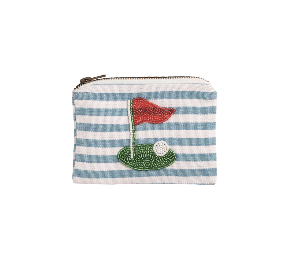 Stripe cotton zipper pouch features beaded icon appliqué.