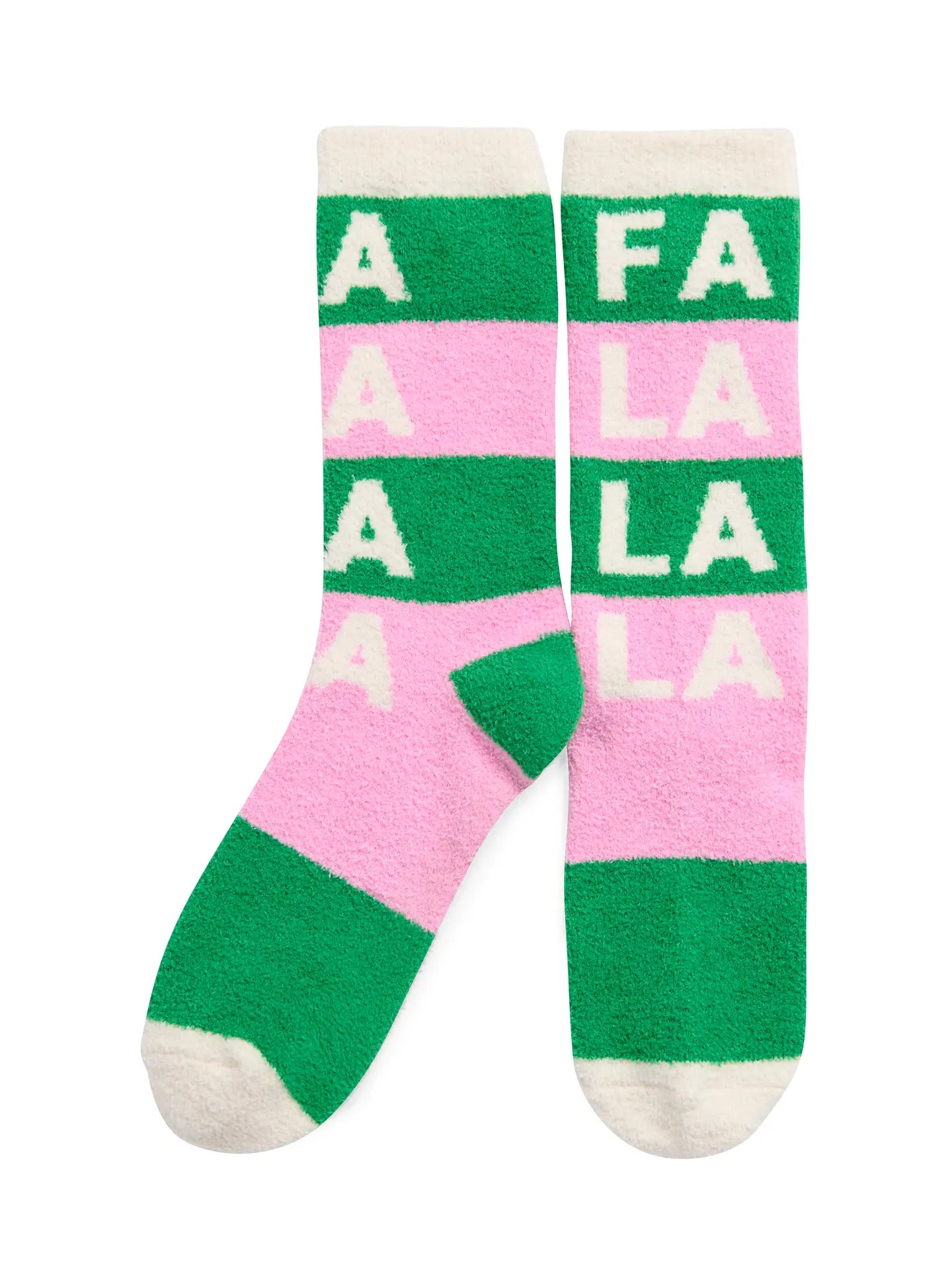 - The "Fa La La" Socks bring a festive pop of color with bold pink and green stripes and a playful holiday message stacked from top to toe.