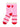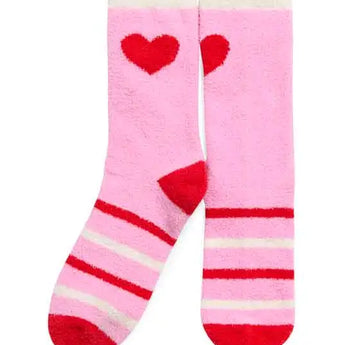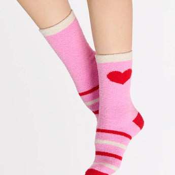 • These cozy crew socks feature a pink base with playful red hearts and candy-stripe inspired bands near the ankle.