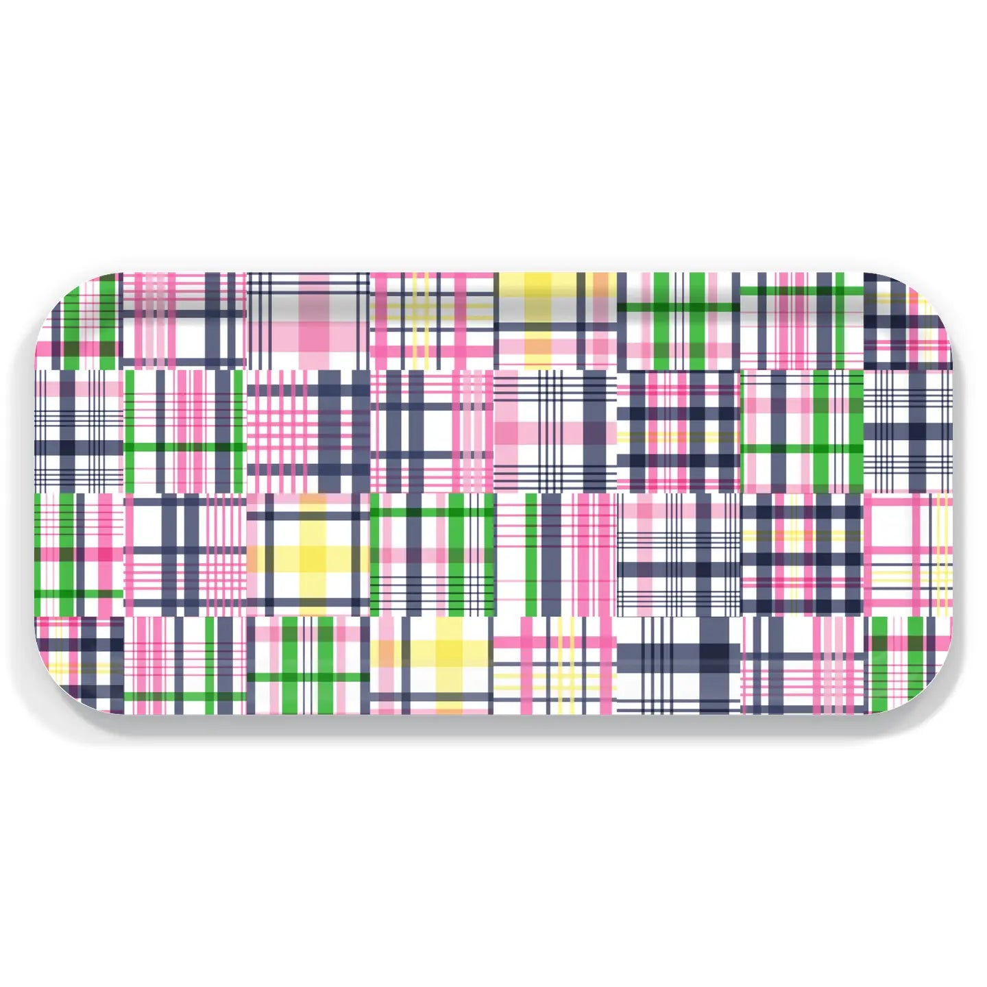 - Bright, bold, and bursting with prep-school charm, the Easton Madras tray is a summer staple. This eye-catching piece features a patchwork of classic madras plaids in shades of pink, navy, green, and yellow—instantly evoking coastal living, breezy brunches, and polo weekends. Use it as a serving tray, centerpiece base, or wall display.
