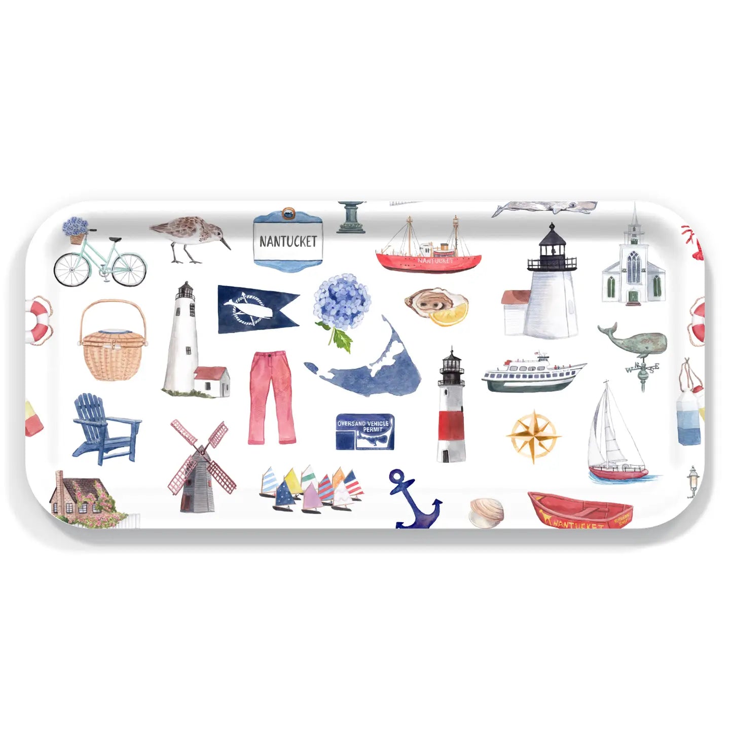 - Celebrate the timeless appeal of Nantucket with this beautifully illustrated tray, featuring iconic symbols like the lighthouses, hydrangeas, Nantucket baskets, red pants, whaling ships, lobster, bikes, and more. This design captures the spirit of island life, making it the perfect gift or collectible for Nantucket lovers. Crafted from FSC-certified birchwood with a durable, food-safe laminated finish. Lightweight, heat- and water-resistant—ideal for entertaining, serving, or display.